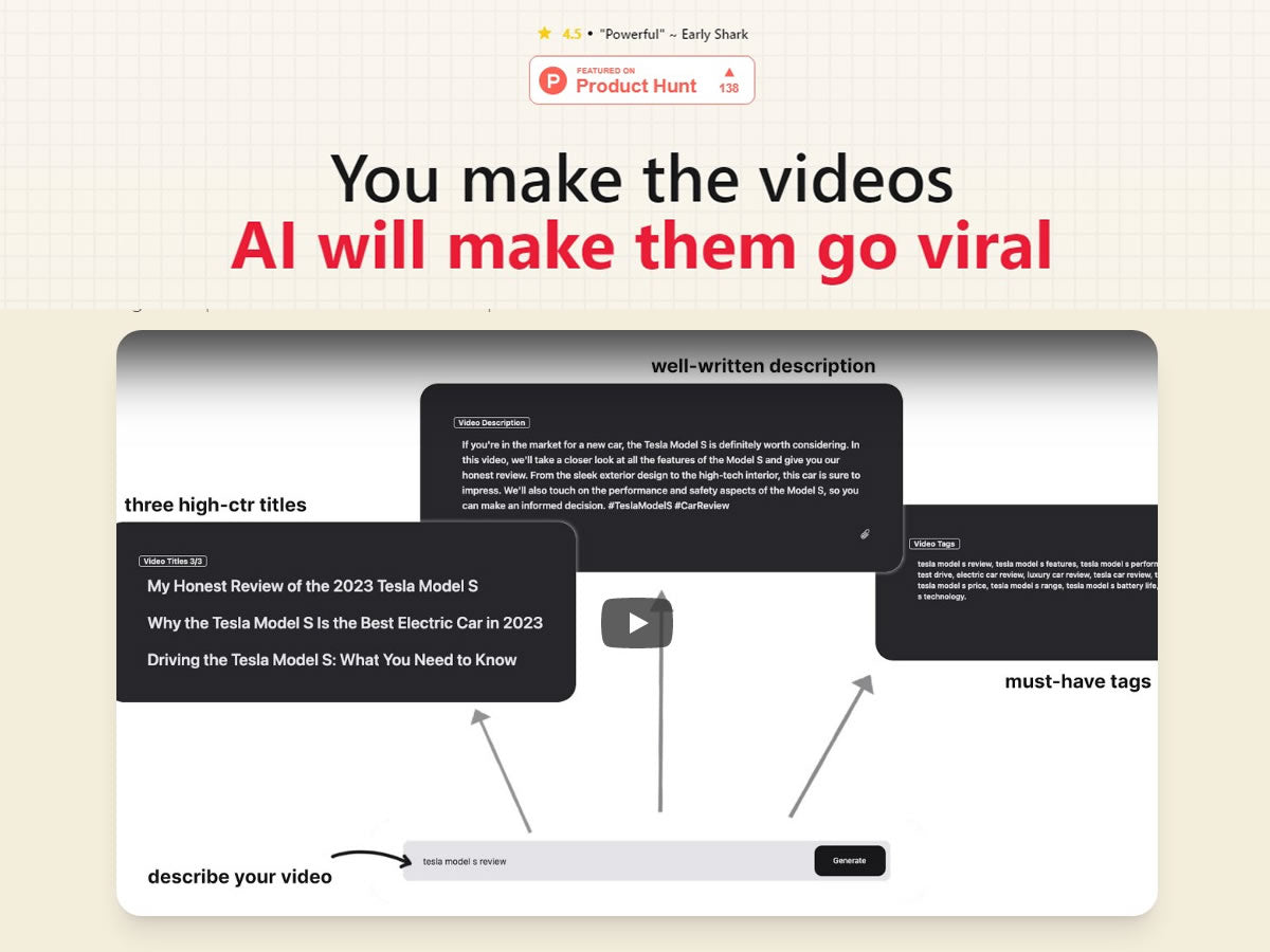 - Simply describe your video in a few words and get three of the most optimized titles to use with it, tags for the highest exposure and a well-written description. In seconds.